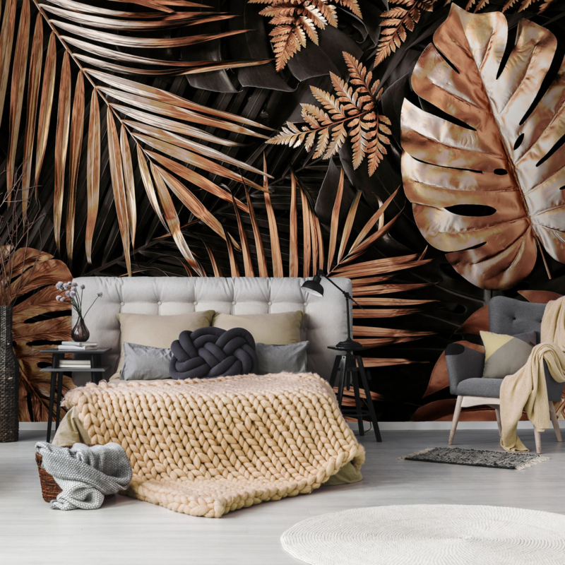 Fotobehang Monstera muurschildering goud zwart